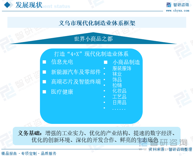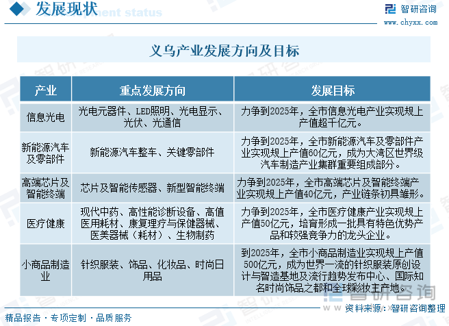 正在《义乌市“十四五”制制业高质量成长规划 》政策中,义乌市明白了“4+X”财产沉点成长标的目的及方针。提出到2025年,成为世界一流的针织服拆原创设想取智制及风行趋向发布核心、国际出名时髦饰品之都和全球彩妆从产地。力争到2025年,全市消息光电财产实现规上产值超千亿元。力争到2025年,全市新能源汽车及零部件财产实现规上产值60亿元,成为大湾区世界级汽车制制财产集群主要构成部门。