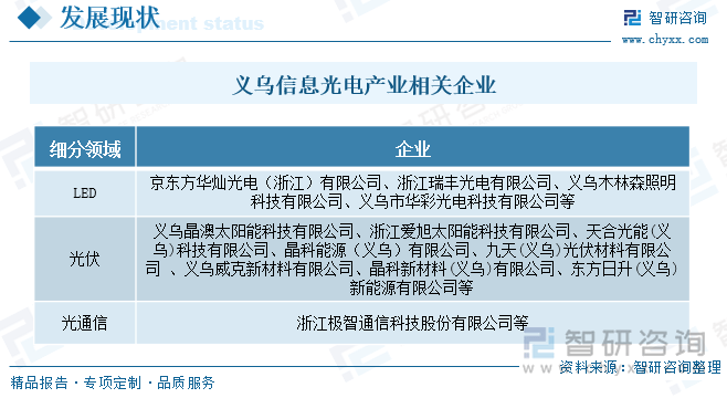 以光通信、光电显示、光照明(半导体照明)和光伏为从体的消息光电财产,已成为电子消息财产中高成长、高带动的计谋性财产,具有优良的成长前景,遭到国际财产界的普遍注沉。消息光电财产是义乌市新培育兴起的计谋性新兴财产,财产成长势头迅猛,已成为义乌市主要从导财产之一。义乌市打制了LED、光伏、电子纸等光电财产链,财产成长初具规模,财产集群劣势较着。晶科能源、晶澳太阳能、天合光能等一批世界级光伏企业先后落户义乌。LED财产也集聚了华灿光电、瑞丰光电、木林森照明等一批国内龙头企业,构成了完整的LED芯片、封拆、灯具财产链。